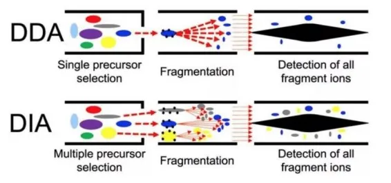 数据非依赖性采集(Data Independent Acquisition,DIA)是近年来发展起来的一种全新的质谱采集定量技术,相比于传统的数据依赖性采集(DDA),它能够克服对于高丰度肽段采集和碎裂的偏向性,实现对样本中所有肽段离子的无遗漏采集,从而大大提高数据的利用度和定量准确性