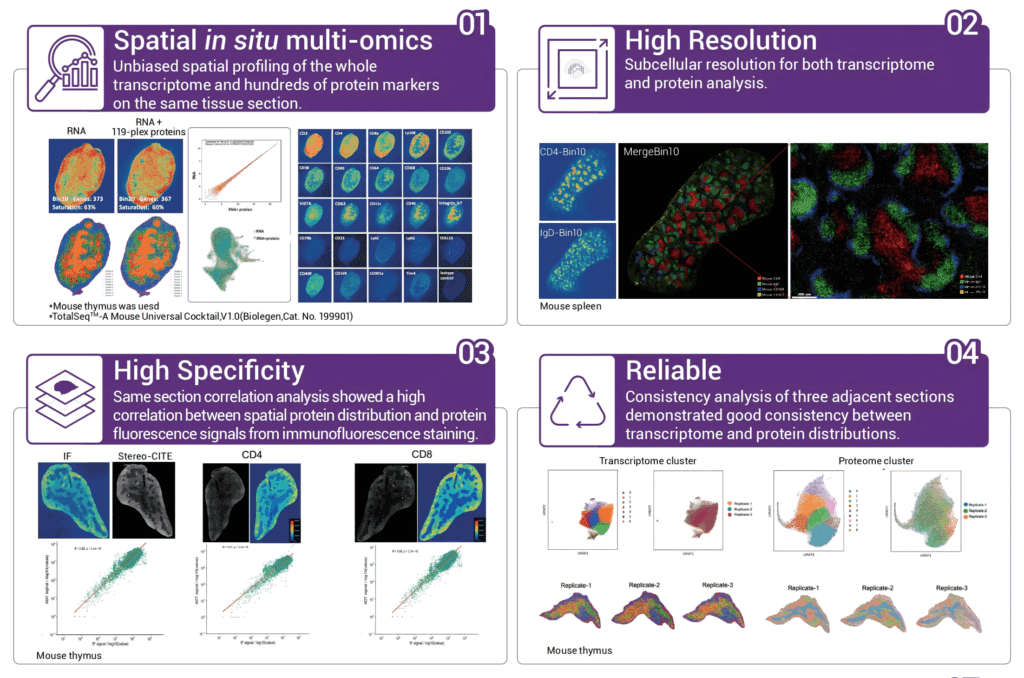 Epitopes by Sequencing (CITE-seq) with the Stereo-seq workflow. It captures mRNA and antibody-derived tags (ADTs) at nanoscale resolution across a centimeter-scale field of view. Through a streamlined “tissue-to-data” workflow, the system delivers spatial maps of transcriptome and protein expression via sequencing and visualization.