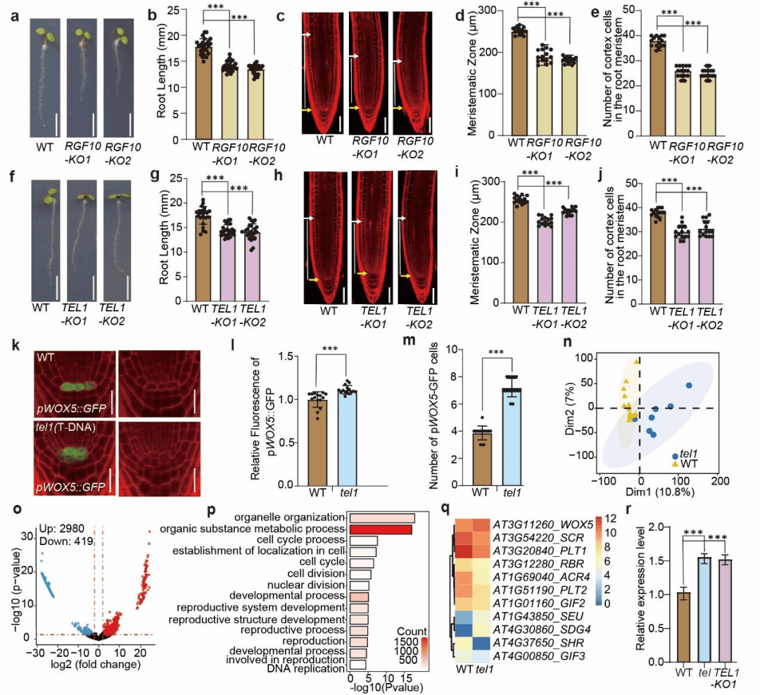 利用CRISPR-Cas9构建RGF10和TEL1敲除株系,结合细胞学观察、单细胞RNA-seq(SMART-seq2)和RT-qPCR,解析其功能。 发现: ● RGF10功能: ○ 敲除后主根变短、分生组织变小(图4a–e),但QC形态正常,提示RGF10主要调控根生长而非QC结构。 ● TEL1功能: ○ 敲除导致主根缩短、分生组织减小,QC结构紊乱、细胞数量增加(图4f–k)。 ○ pWOX5::GFP荧光强度和WOX5表达显著升高(图4l–r),表明TEL1负调控WOX5。 ○ 单细胞转录组分析显示,TEL1敲除后,细胞周期相关基因(如Cyclin、WEE1)上调,证实TEL1通过抑制细胞周期维持QC的“静止”状态(图4o–p)。