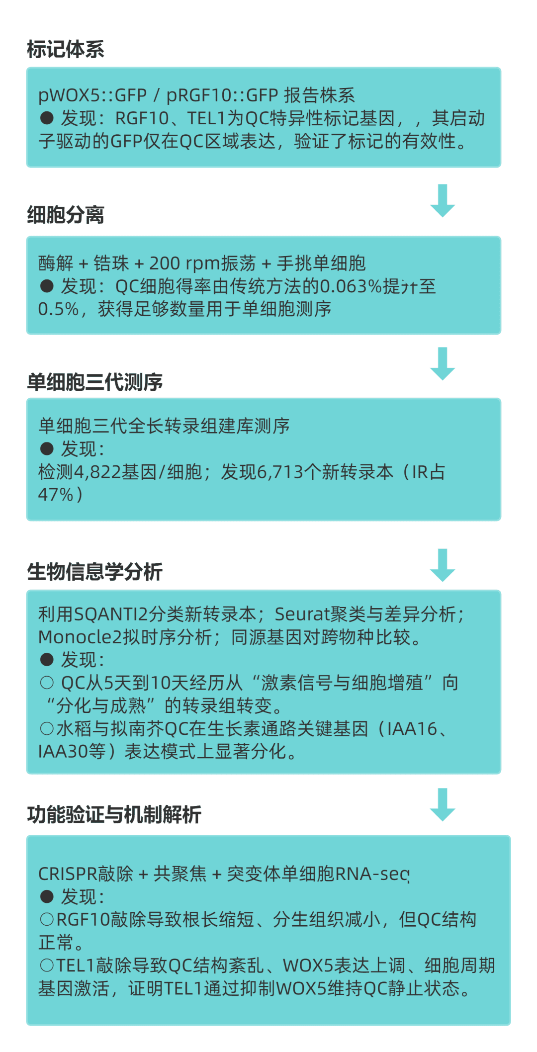 前言 单细胞三代测序揭示植物静止中心的发育轨迹,发表于2026年2月 本研究通过优化稀有细胞分离流程,结合单细胞三代全长RNA测序,首次系统绘制了拟南芥根尖静止中心(QC) 的转录组图谱,揭示了其在发育过程中从激素信号向分化转变的轨迹,发现并验证了新的QC标记基因 RGF10 与关键调控因子 TEL1,并通过跨物种比较揭示了水稻与拟南芥QC在生长素通路上的进化差异。