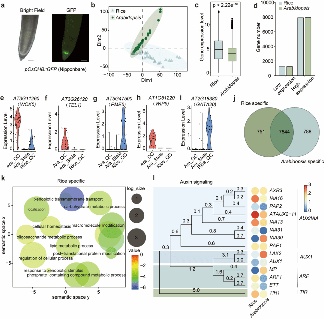 水稻与拟南芥QC的进化差异 图5. 单子叶与双子叶植物QC在转录组结构和激素调控网络上存在明显分化,为作物根系改良提供了重要线索 构建水稻pOsQHB::GFPQC标记系,分离水稻QC细胞进行SCAN-seq,与拟南芥QC转录组进行比较分析。 发现: ● 表达谱差异: ○ 水稻QC中低表达基因比例更高,整体转录活性低于拟南芥(图5c–d)。 ● 同源基因表达模式: ○ 共鉴定出7,644个共同表达基因,但存在物种特异性基因(拟南芥788个,水稻751个)(图5j)。 ○ 水稻特异性基因富集于“细胞稳态”“寡糖代谢”等通路;拟南芥特异性基因富集于“受体激酶信号”等通路(图5k)。 ● 生长素通路分化: ○ 拟南芥QC高表达IAA30、LAX2等,而水稻QC高表达IAA16、IAA13、AUX2/11等(图5l),提示两者在生长素信号转导策略上存在显著进化差异。