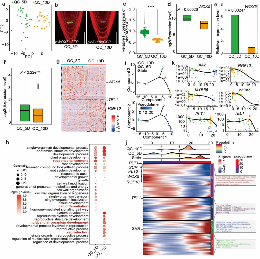 比较5天(QC_5D) 与10天(QC_10D) 的QC细胞转录组,结合拟时序分析(Monocle2),追踪QC发育轨迹。 发现: ● 发育阶段差异: ○ QC_5D高表达细胞周期、生长素响应基因;QC_10D则高表达与根分化相关的基因(图3g–h)。 ○ WOX5表达在QC_5D中显著更高,与pWOX5::GFP荧光强度下降趋势一致(图3b–e)。 ● 拟时序轨迹: ○ 从QC_5D → QC_10D → 中柱细胞,呈现出从“激素合成与细胞分裂”向“细胞壁合成与根发育” 的功能转变(图3i–k)。 ○ 关键基因如IAA2(生长素诱导)在早期高表达,而PLT1(分化相关)在后期上升。