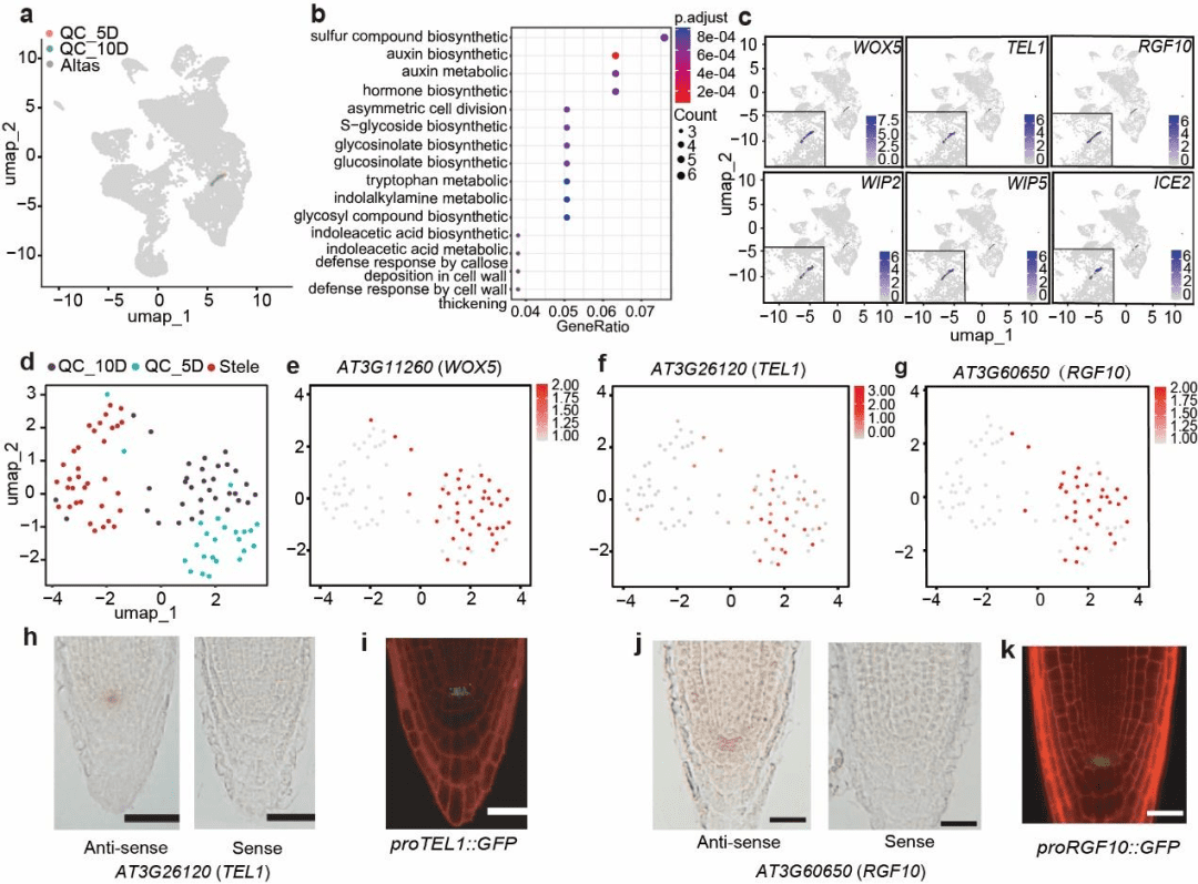 将单细胞三代全长RNA测序数据与已发表的拟南芥根单细胞图谱整合(UMAP聚类),筛选QC富集基因,并通过原位杂交和转基因报告株系进行验证。 发现: ● 已知标记验证:WOX5被确认为QC最显著上调基因,验证了数据可靠性。 ● 新标记发现: ○ RGF10和TEL1被鉴定为QC特异性基因,其表达在QC细胞中高度富集(图2f–g)。 ○ 通过RNA原位杂交和proTEL1::GFP、proRGF10::GFP报告株系,证实两者仅在QC区域表达(图2h–k)。 ● 功能提示:GO分析显示QC富集基因显著参与“生长素合成”通路(图2b),与QC的干细胞调控功能一致。