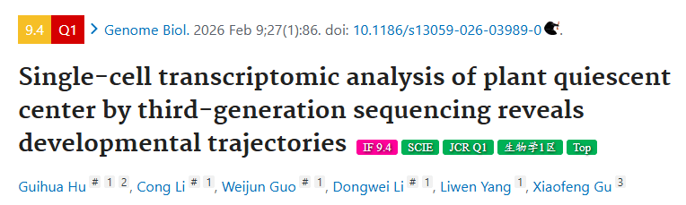 参考文献 Hu, G., Li, C., Guo, W., Li, D., Yang, L., & Gu, X. (2026). Single-cell transcriptomic analysis of plant quiescent center by third-generation sequencing reveals developmental trajectories. Genome Biology. https://doi.org/10.1186/s13059-026-03989-0