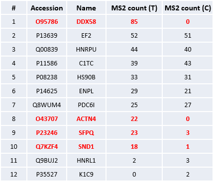 在实验组T和对照组C中鉴定到的蛋白可以分为两大类:一类是在T组含量比在C组多的蛋白,另一类则是含量相当或在C组更多的蛋白。根据实验目的,需要关注的蛋白是第一类,作为互作的候选蛋白。部分鉴定结果如下表所示,靶标蛋白DDX58只在实验组T中被检测到,ACTN4、SFPQ、SND1则可能是DDX58的相互作用蛋白。基于蛋白质丰度越高,采集到的二级谱图数越多的原则,我们采用谱图计数方法进行蛋白含量相对比较,结果见下表: