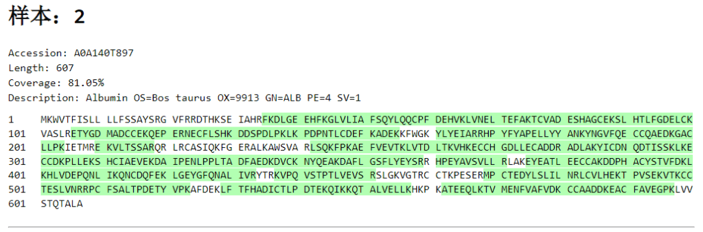 LC-MS/MS蛋白鉴定使用高分辨液相色谱-质谱联用系统对目的条带进行质谱检测分析,按照蛋白丰度排序的蛋白质鉴定列表方式进行报告反馈。其基本原理是利用质谱仪得到二级质谱的离子峰分布来鉴定样品中的肽段,进而鉴定蛋白种类。