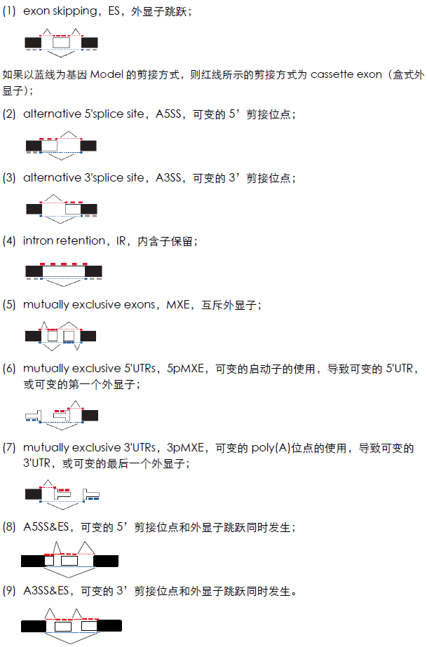 可变剪接方式主要分为exon skipping(ES),alternative 5’splice site(A5SS),alternative 3’splice site(A3SS),intron retention(IntronR),mutually exclusive exons(MXE),mutually exclusive 5’UTRs( 5pMXE),mutually exclusive 3’UTRs(3pMXE)(Wang, Sandberg et al. 2008),除此之外还有cassette exon,A3SS&ES和A5SS&ES。