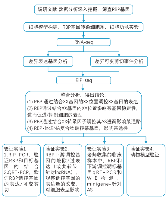 通过文献检索,数据库分析等方式,确定和疾病研究相关的RBP,根据RBP具体的功能,利用转录组测序技术(RNA-seq),从整体水平研究RBP沉默/过表达对基因表达模式,表达水平,功能通路以及可变剪接事件的影响,提供全面的转录组信息。还可以选择细胞功能实验:细胞增殖、凋亡、侵袭、转移以及和特定疾病相关的功能实验。