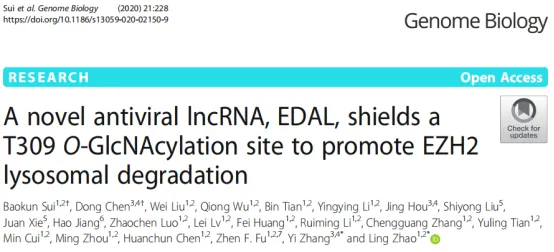 Title:A novel antiviral lncRNA, EDAL, shields a T309 O-GlcNAcylation site to promote EZH2 lysosomal degradation