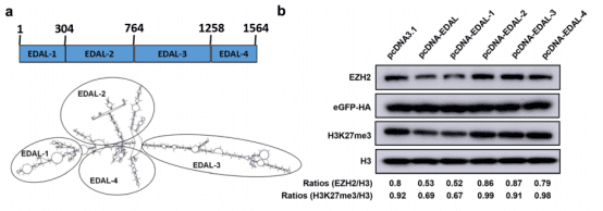 为了深入探究 EDAL 中哪个序列段落对其抗病毒功能至关重要,研究人员在剖析 EDAL 构造的基础上,将其划分为四个部分,并逐一检验了它们对 EZH2 降解的影响。RNA pull down结果表明,唯独 EDAL-1 能显著减少 EZH2 和 H3K27me3 的水平以及狂犬病病毒的增殖。通过在 EDAL-1 中移除不同序列,研究者确定了位于 98-153 位点之间、长度为 56 个碱基的序列可能是其抗病毒活性的核心。当这段序列被整合到其他长链非编码 RNA(lncRNA)结构中时,同样观察到了抗病毒效果。