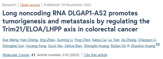 中文标题:长链非编码 RNA DLGAP1-AS2 通过调节 Trim21/ELOA/LHPP 轴促进结直肠癌的肿瘤发生和转移