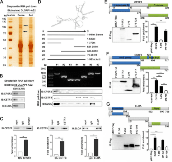 在机制上,通过RNA pull down和RIP等技术,研究者们鉴定出了与DLGAP1-AS2相互作用的结合蛋白CPSF2、CSTF3和ELOA;揭示了DLGAP1-AS2通过促进E3泛素化连接酶Trim21与转录延伸因子A (ELOA)之间的相互作用,增加ELOA的泛素化降解,从而抑制其对下游靶标基因LHPP的转录激活,导致AKT信号通路的活化,进而促进肿瘤的发生和发展。此外,研究还证实了CPSF2和CSTF3能够与DLGAP1-AS2结合,并共同作用以增强其稳定性。